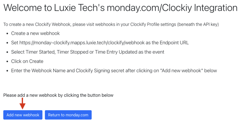 The Endpoint URL should be: https://monday-clockify.mapps.luxie.tech/clockify/webhook.