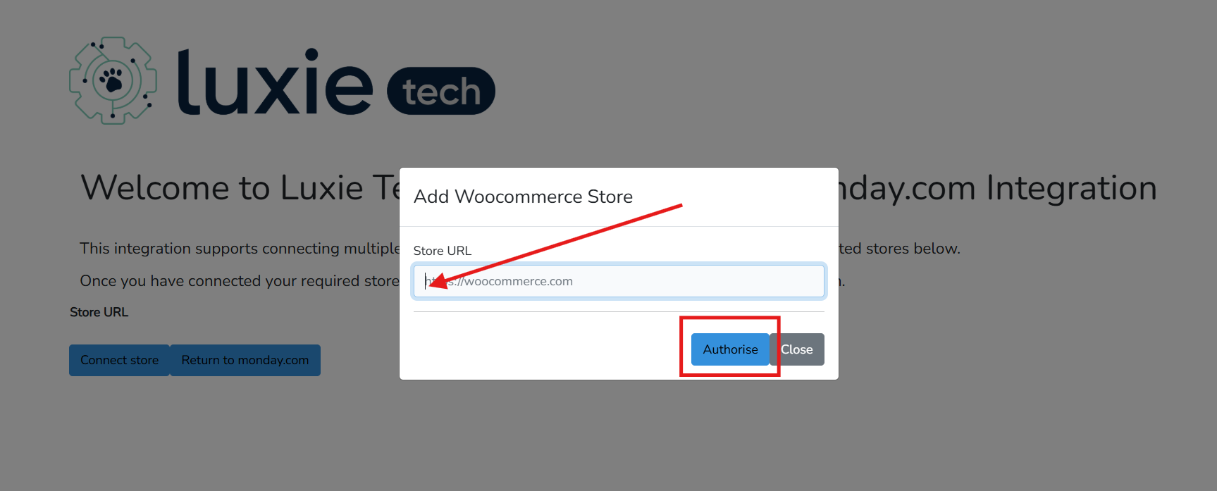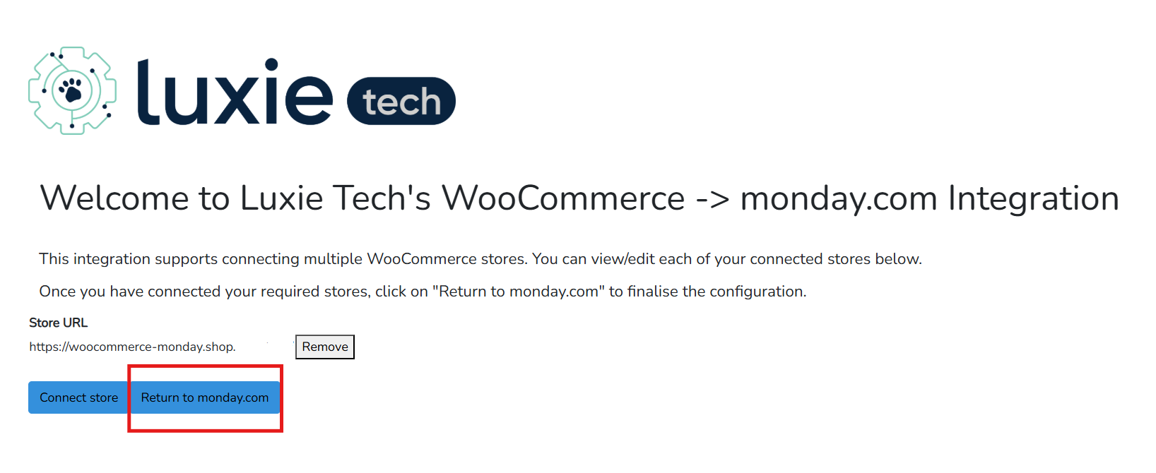 - Click the Connect Store button to link one or more WooCommerce stores to your monday.com integration.
