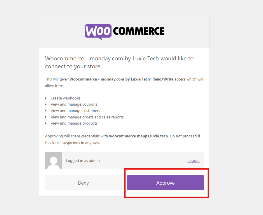 You only need to authorize WooCommerce once. If you have previously connected your store or set up a WooCommerce recipe, simply skip the authorization steps and click Return to monday.com. You will automatically be redirected to the recipe setup page.
