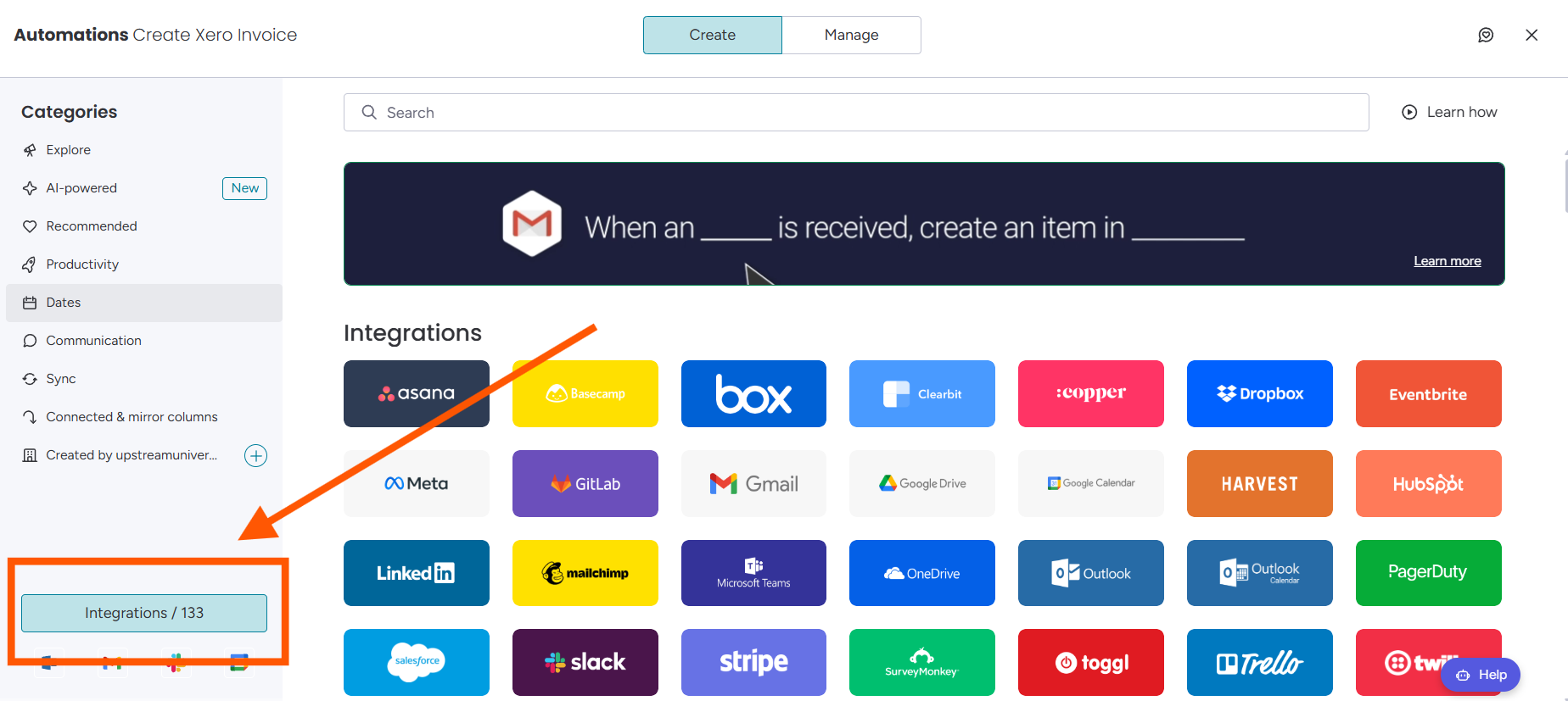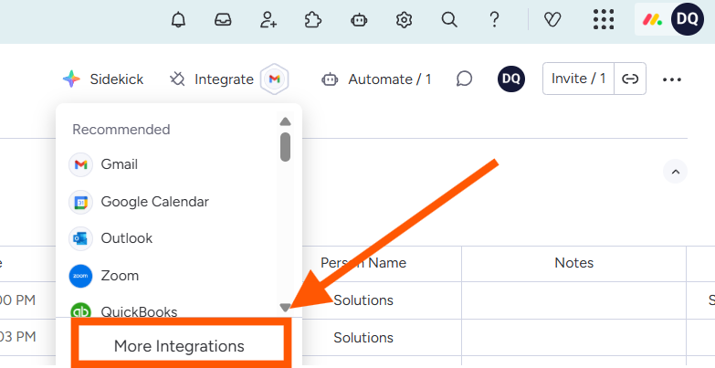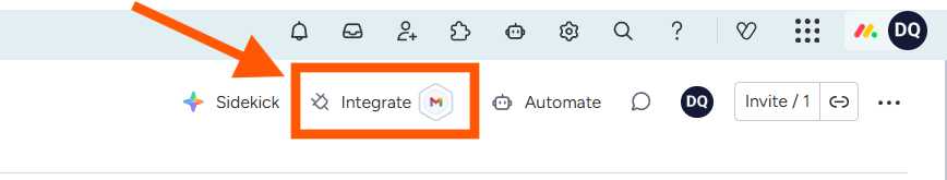 - Click Integrate in the upper-right corner of your monday.com board.